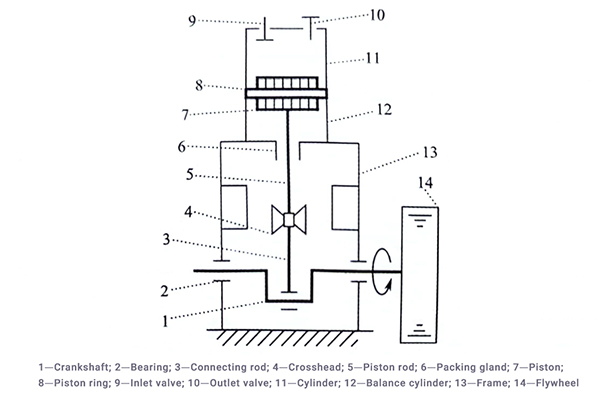 Ein einstufiger Kolbenkompressor ist wie im Diagramm dargestellt aufgebaut. Der Motor dreht das Schwungrad, das die Kurbelwelle (1) dreht. Die Kurbel an der Welle bewegt das große Ende der Pleuelstange (3) in einer Kreisbewegung. Diese Bewegung wird durch die Stange bis zu ihrem kleinen Ende übertragen und treibt den Kreuzkopf (4), die Kolbenstange (5) und den Kolben (7) in einer geraden Linie hin und her.